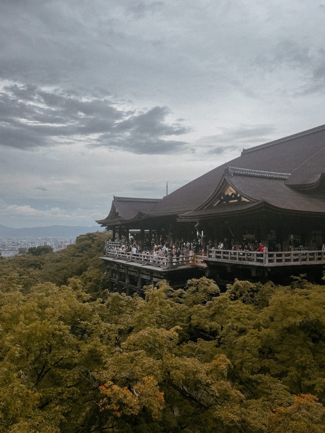 Kiyomizu-dera sits on a hillside overlooking eastern Kyoto. In autumn, the forest below the main hall turns red and orange, creating one of the most iconic views in the city.