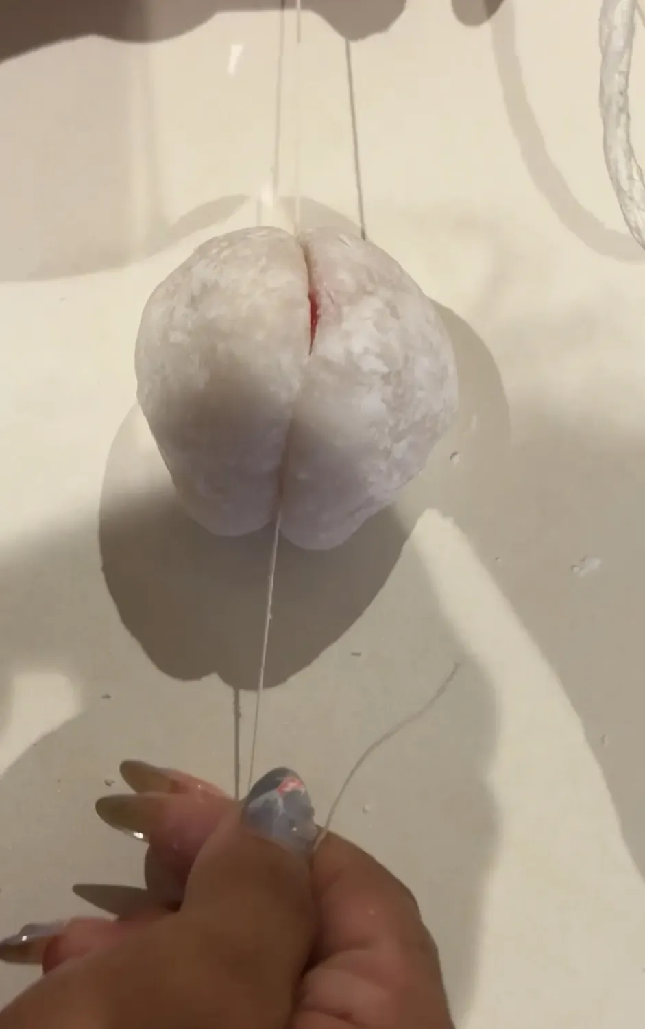 You place the string under the mochi, cross the ends over the top, and pull gently. It slices it cleanly in half.