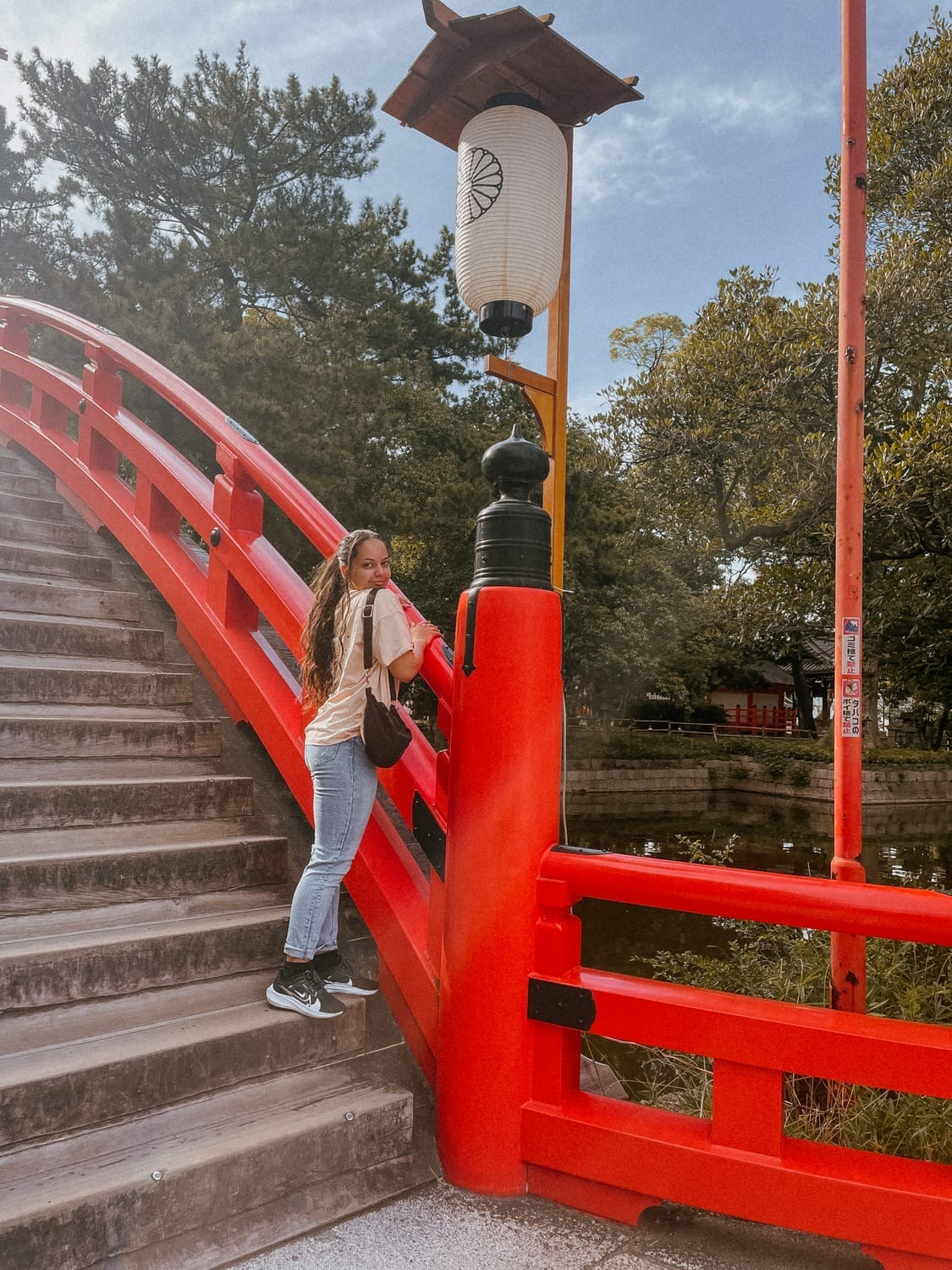 The shrine is calm and spacious, with the iconic red arched Taiko Bridge crossing the pond. It has long been associated with protection for travelers and sailors and still hosts traditional ceremonies.